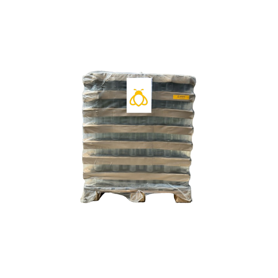 Les pots en verre, parfaits pour conserver le miel de nos abeilles, sont soigneusement conditionnés afin d’assurer une livraison sans casse. La palette de pot de verre d’une contenance de 750 ml est conditionnée en couche de 150 pots sur 7 couches. Les détails du produit, tels que la référence et les quantités, sont clairement indiqués sur l’emballage. Nos emballages en plastique sont réduits au minimum dans le but de préserver l’environnement et favoriser une consommation responsable.